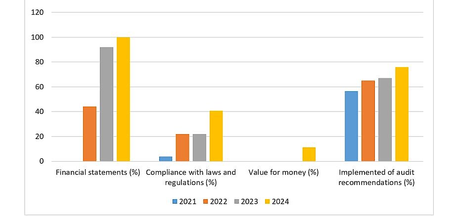 Furthermore, entities that obtained an unqualified opinion in value for money increased by 7% compared with the previous year, from 59% to 66%. The implementation rate of audit recommendations also rose slightly, from 59% to 60%.